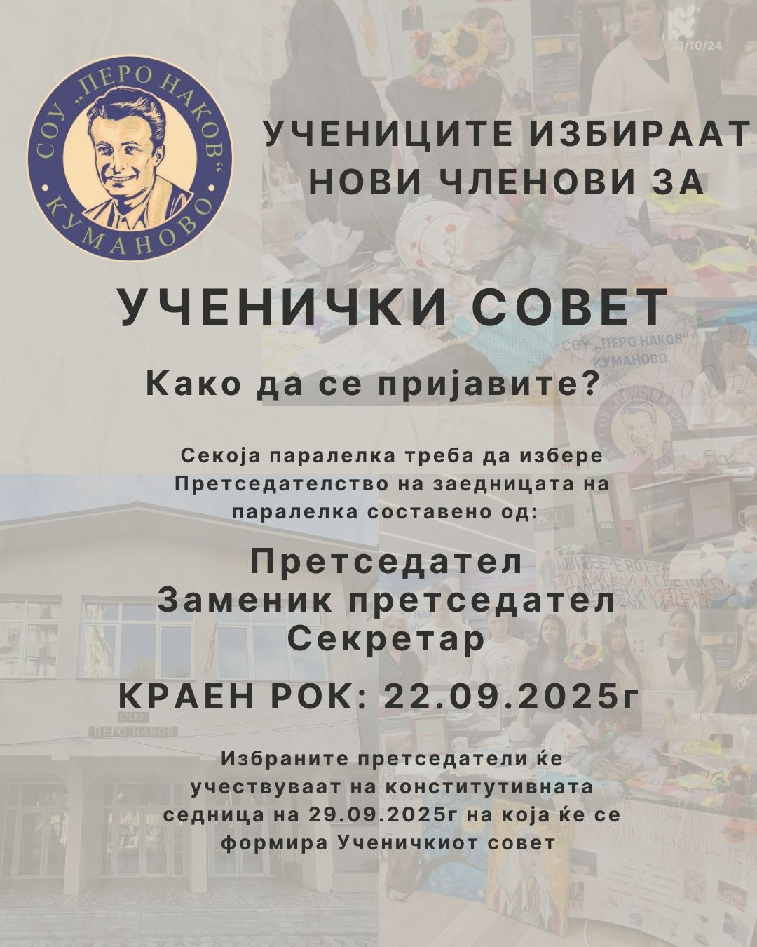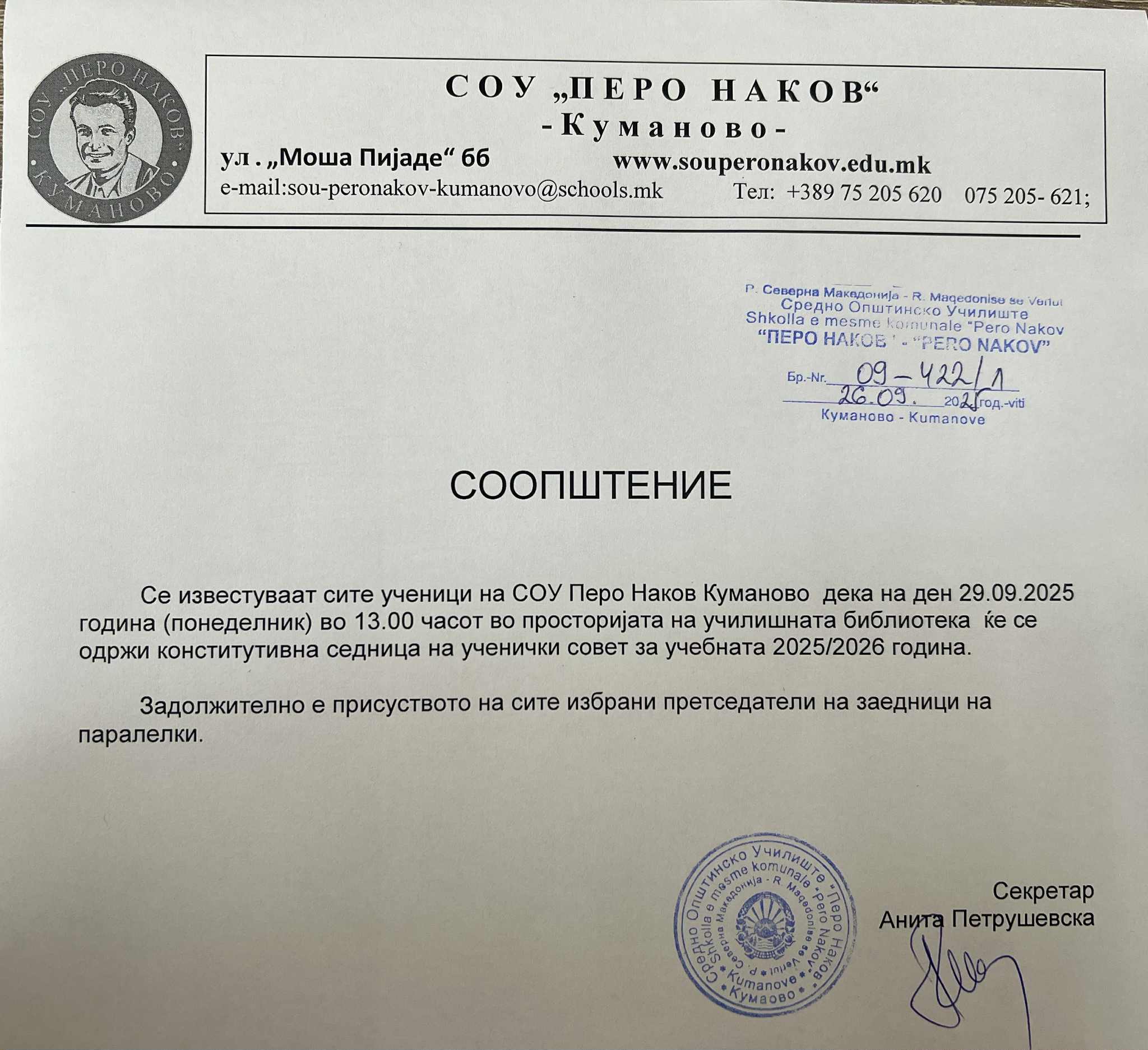 Оглас за запишување на ученици во прва година во СОУ „Перо Наков“ Куманово, во учебна 2025/2026 година