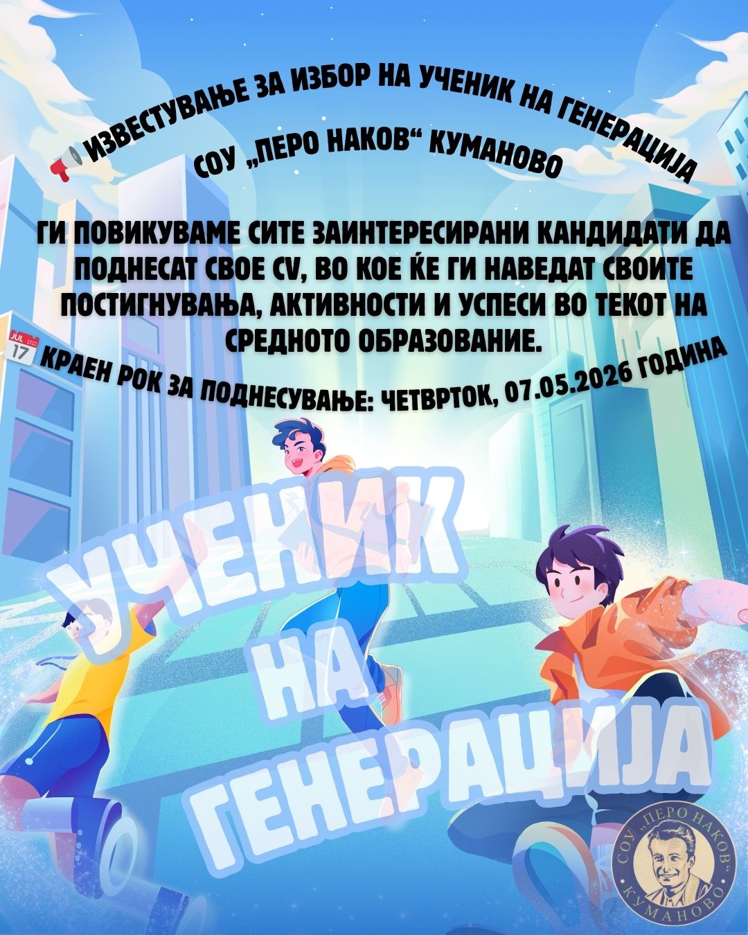 Оглас за запишување на ученици во прва година во СОУ „Перо Наков“ Куманово, во учебна 2025/2026 година